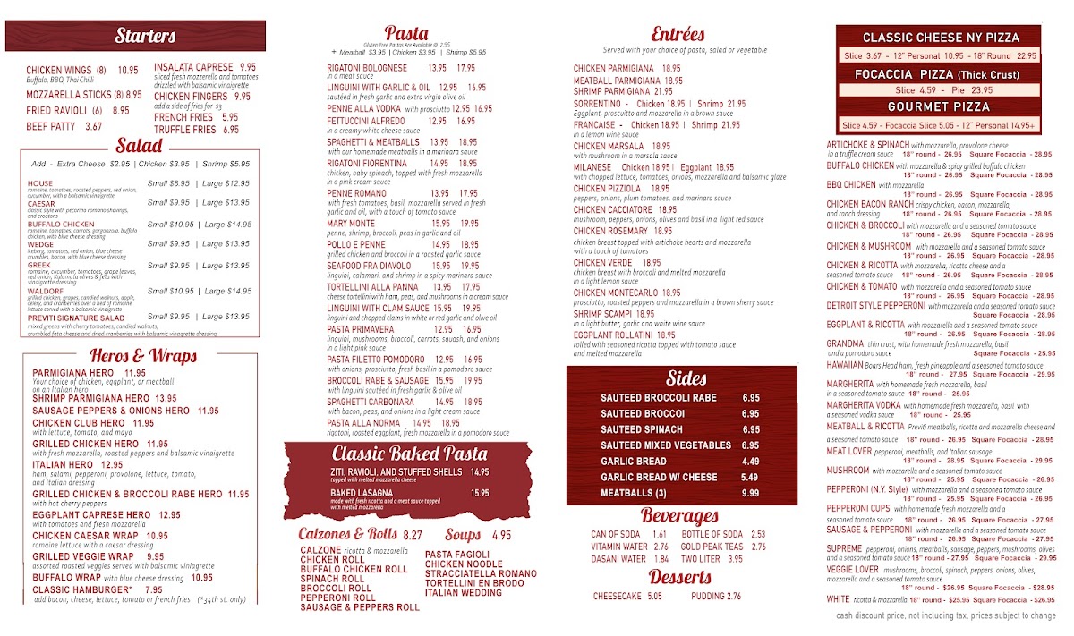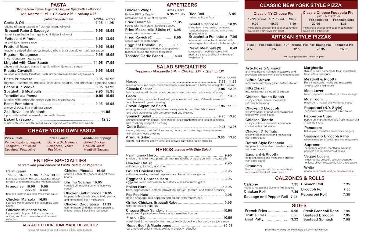 Overall, Previti Pasta & Pizza’s menu provides a broad selection of dishes, from comforting pastas and sandwiches to savory pizzas and fresh salads, all at reasonable prices. Whether you're dining in or ordering to-go, there's something for everyone to enjoy.